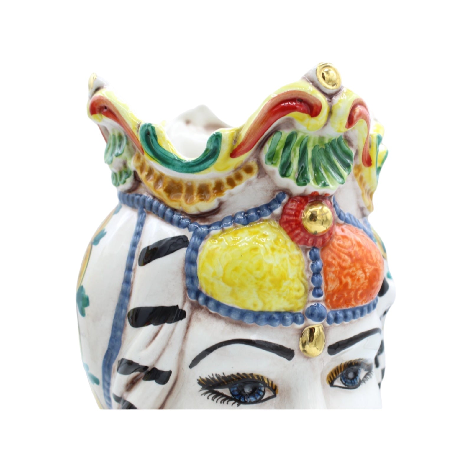 Couple of Caltagirone Ceramic Moor’ s Heads , approx. h 25 cm. With Crown, Turban and 24 Carat Pure Gold Details